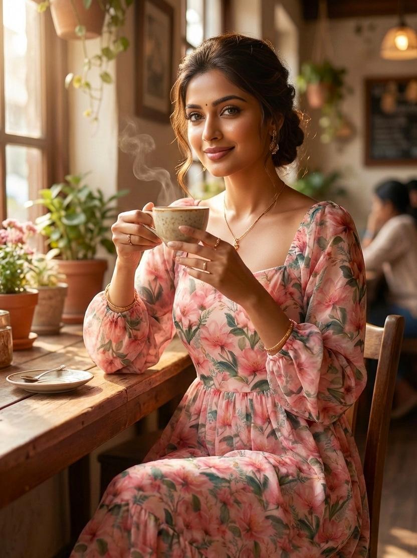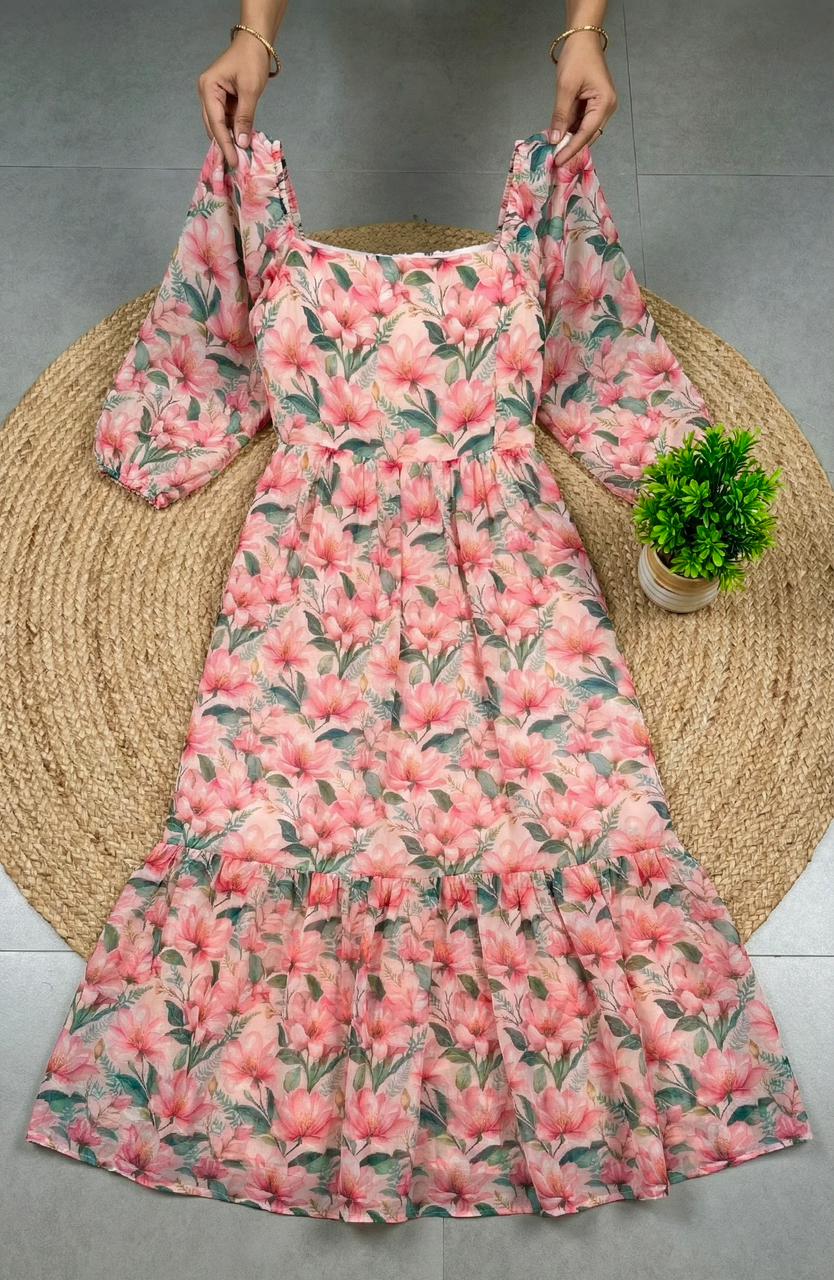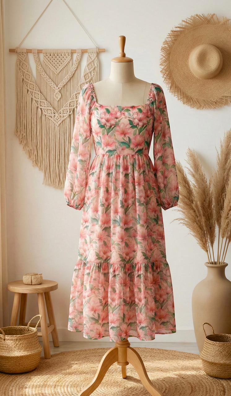 A beautiful floral maxi dress designed with a soft, flowy silhouette for an elegant boho look. The stylish square neckline with long bishop sleeves and a ruffle tier hem adds charm and graceful movement. Perfect for casual outings, brunch dates and summer days.