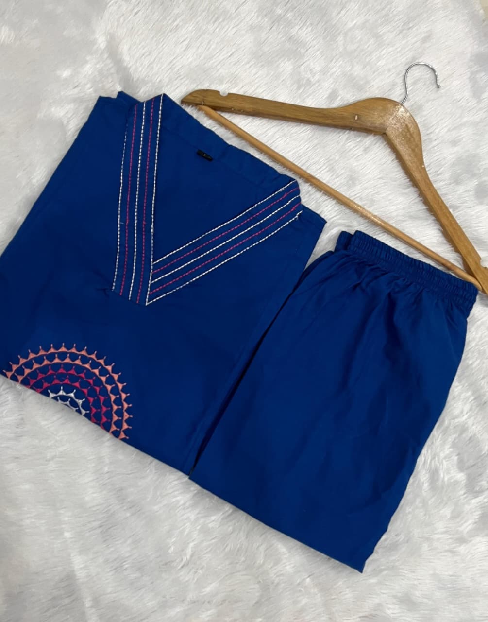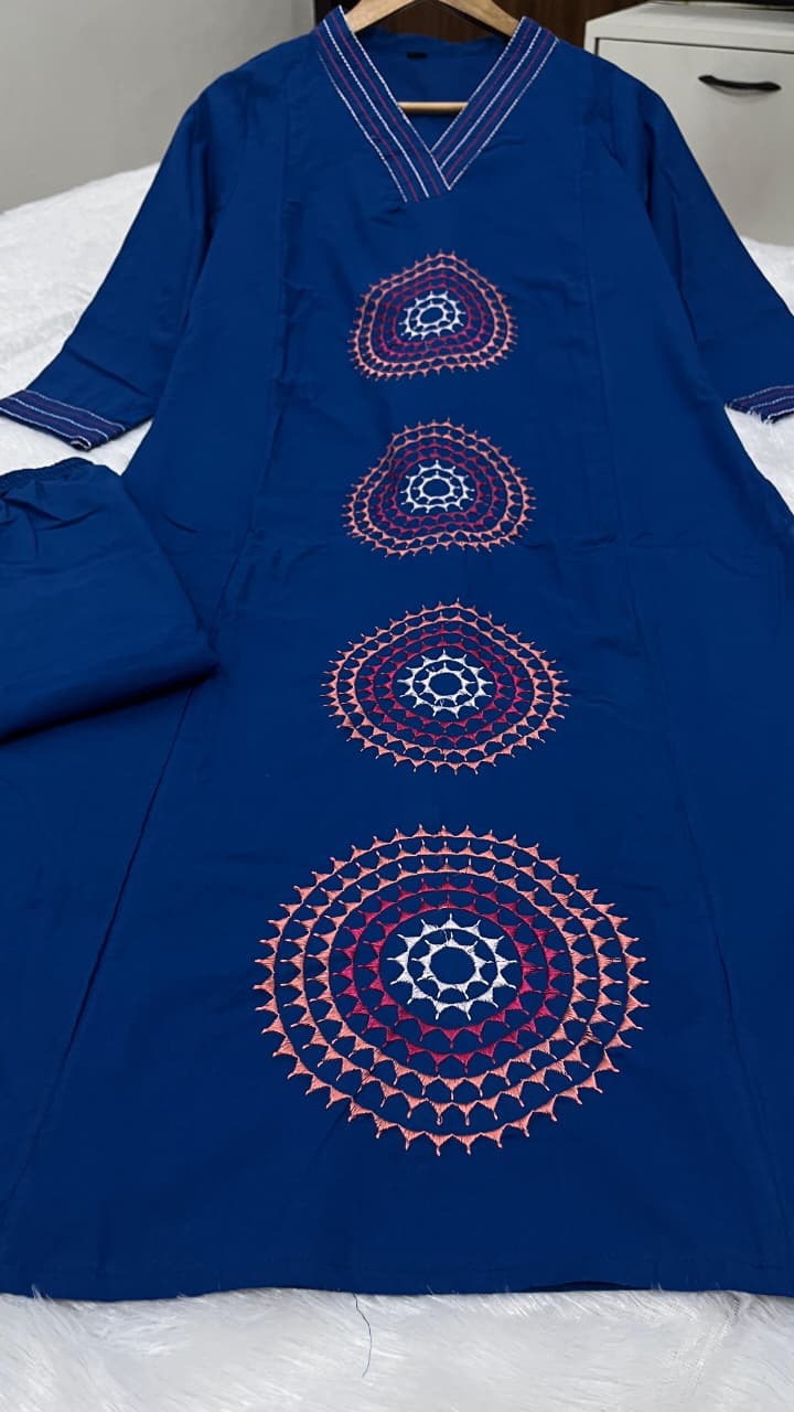 Blue cotton kurta with circular embroidery. Paired with matching pants. Comfortable, elegant, and perfect for daily or casual wear.
