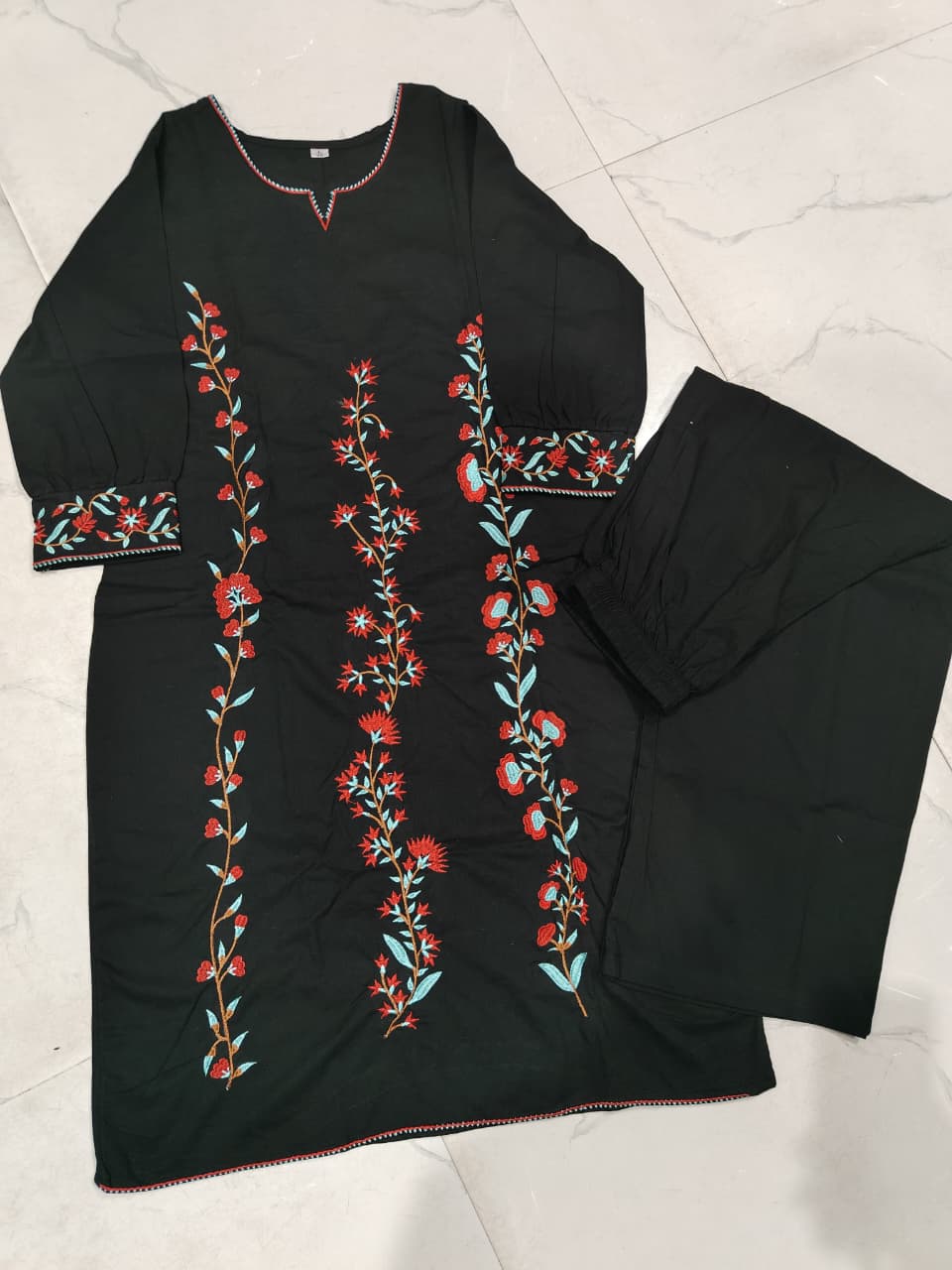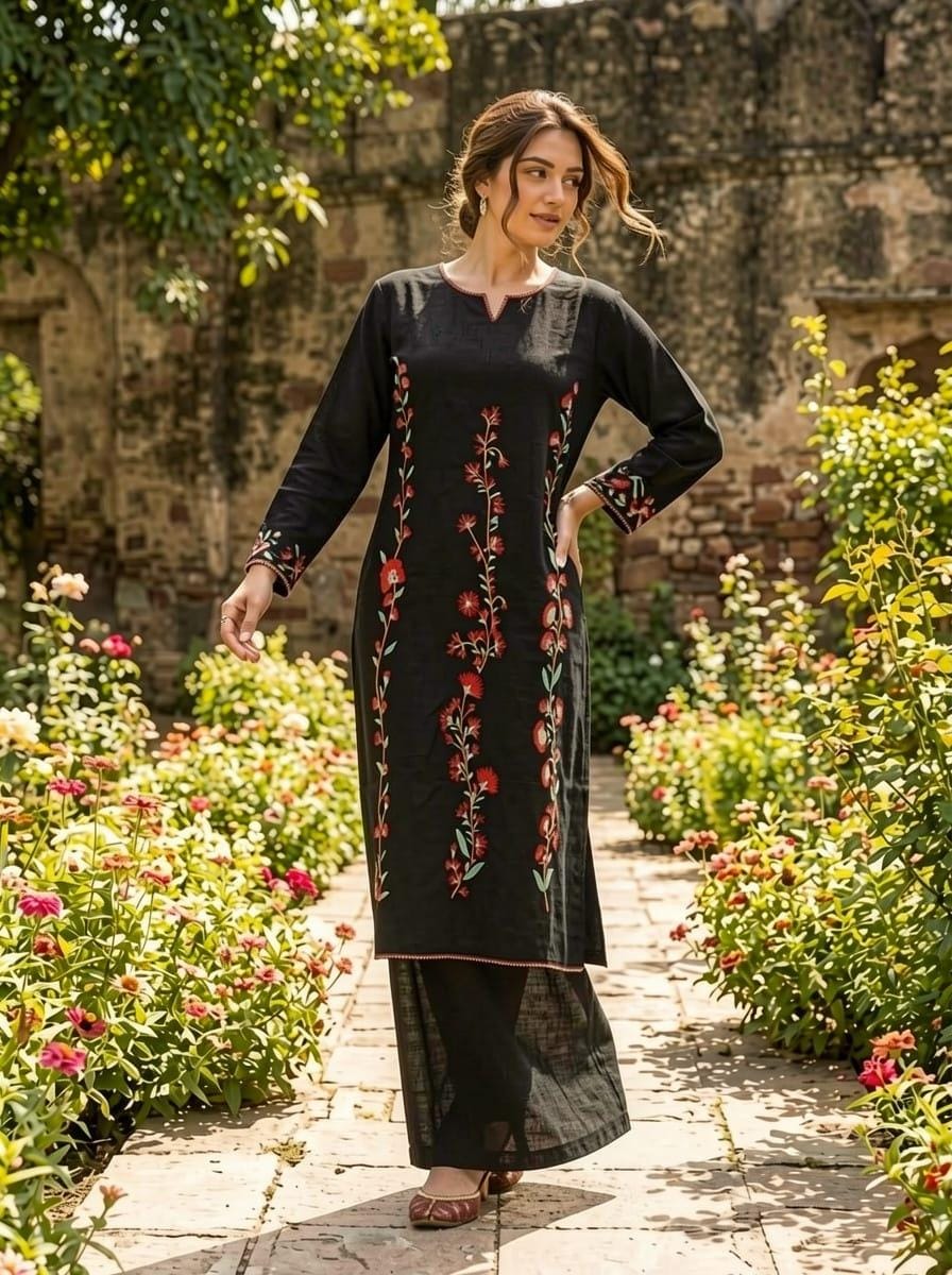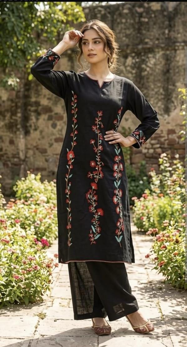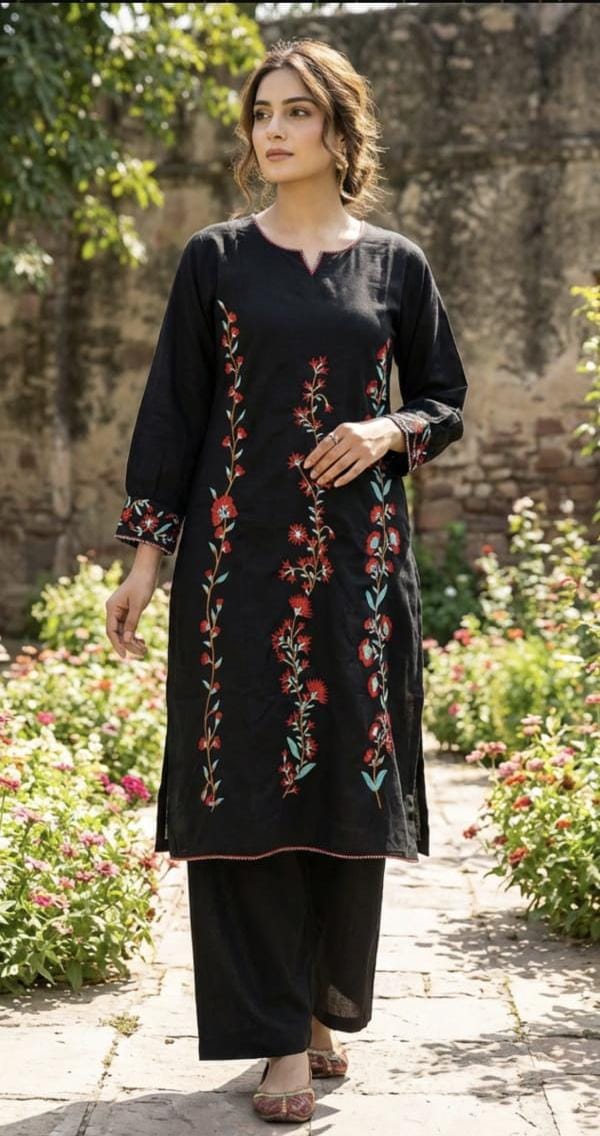 ✨ Product Details: • Fabric: Fine Cotton • Work: Elegant Floral Embroidery • Style: Co-Ord Set (Kurti + Plazo) • Color: Classic Black • Fit: Comfortable & Stylish • Season: Perfect for Summer Wear