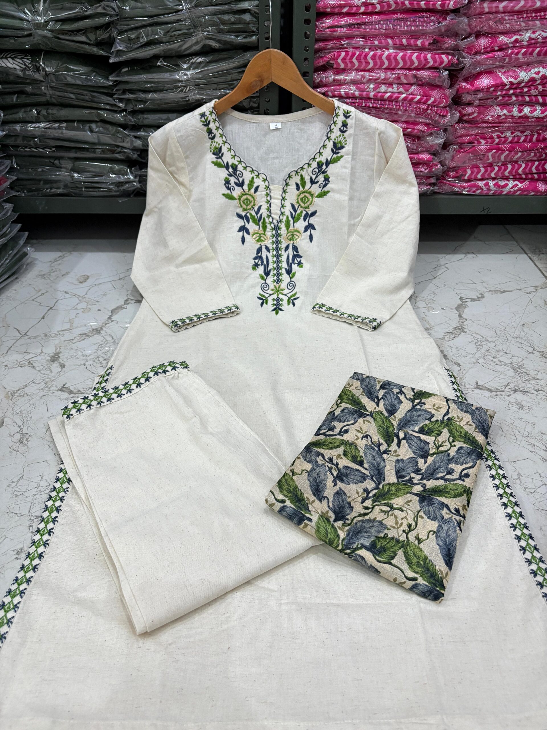 ✨ Product Details: • Fabric: Premium Cotton Flex • Color: Elegant Cream • Work: Heavy Embroidery on Kurta & Sleeves • Bottom: Matching Cotton Pants with Embroidery • Dupatta: Original Khadi Silk Printed Dupatta