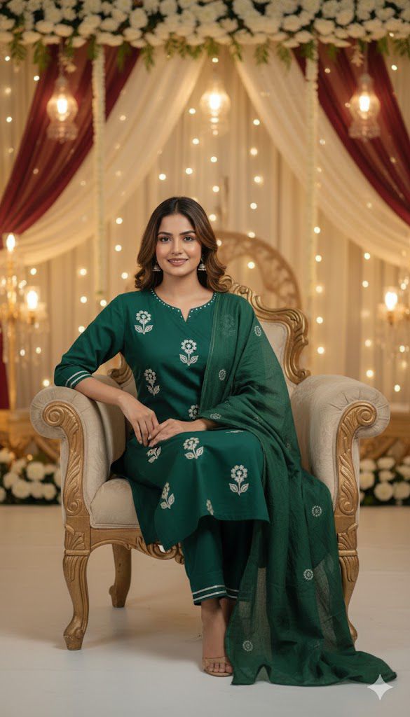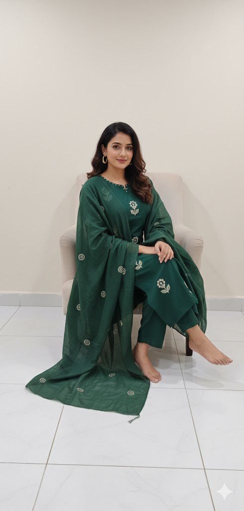 Elevate your festive style with this elegant Cotton Party Wear Suit Set, designed in a straight silhouette with intricate full front embroidery. A perfect blend of sophistication and comfort for celebrations & special gatherings.