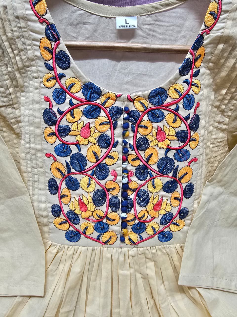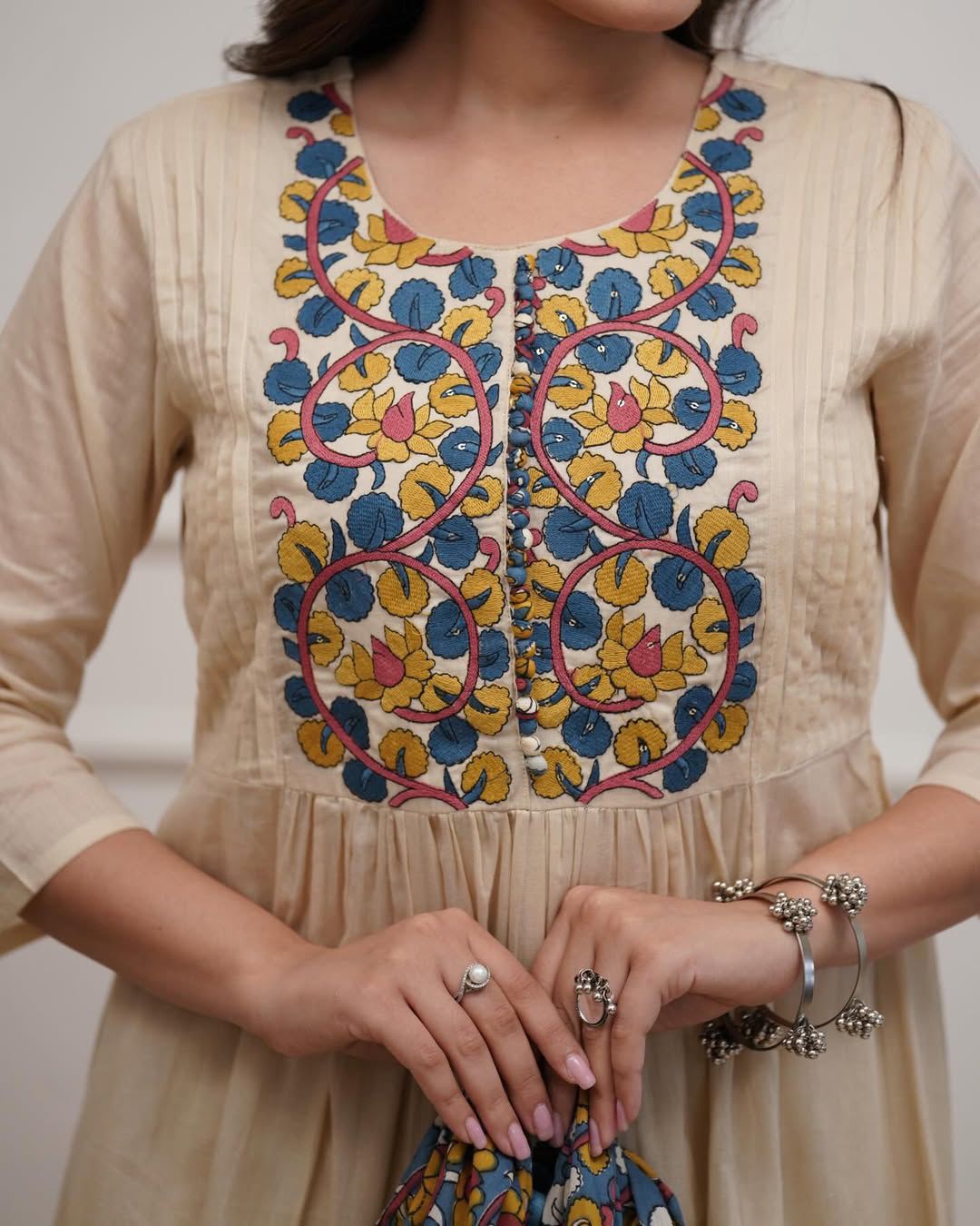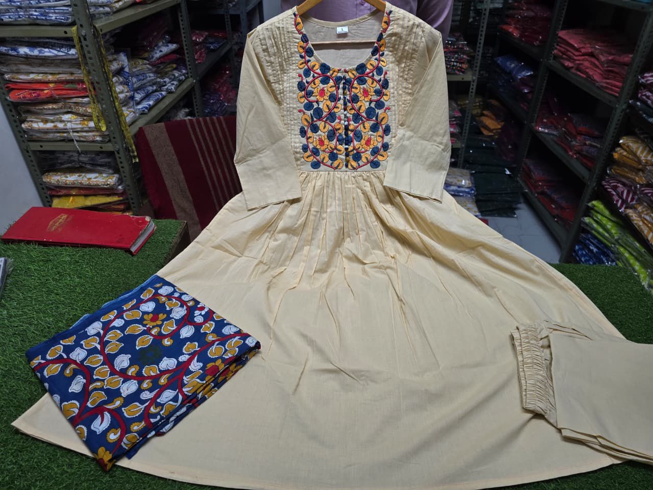 ✨ Product Details: • Fabric: Pure Cotton 60-60 • Work: Full Embroidery with Pintex Neck Detailing • Kurti Length: 47 inches • Pant Length: 38 inches • Dupatta: 2.5 Meter Pure Cotton Kalamkari Printed Dupatta • Pocket: One Side Pocket • Sleeves: 3/4 Sleeves • Set Includes: Kurti + Pant + Dupatta