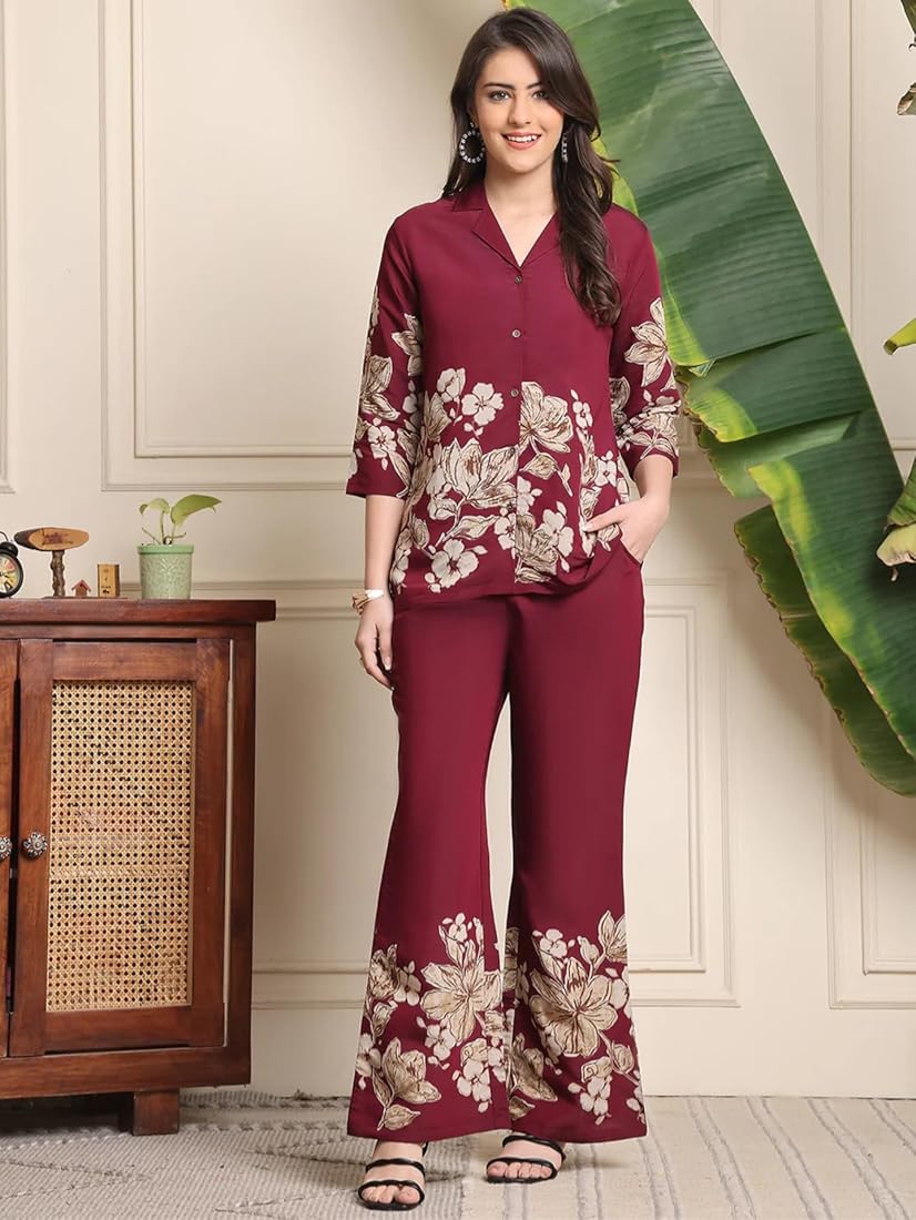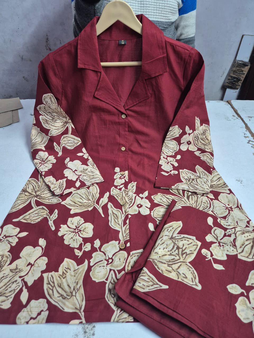 Step into effortless style with this elegant printed cotton co-ord set, designed for modern comfort with a bold traditional touch. The rich maroon shade paired with beautiful floral discharge print creates a classy and eye-catching look, perfect for casual outings, travel, or relaxed day wear.
