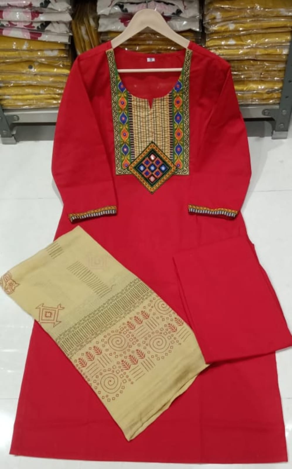 & Free ShippingRed cotton kurta set with ethnic embroidery on neckline. Comes with matching pants and printed dupatta. Comfortable, stylish, and perfect for daily or festive wear.