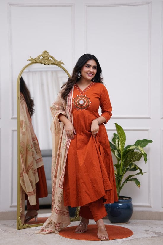 Add a touch of elegance to your ethnic collection with this beautiful Rust Anarkali Suit Set. Crafted from premium cotton fabric, this outfit offers both comfort and graceful style. The intricate mirror work on the neckline enhances its festive charm, making it perfect for special occasions.