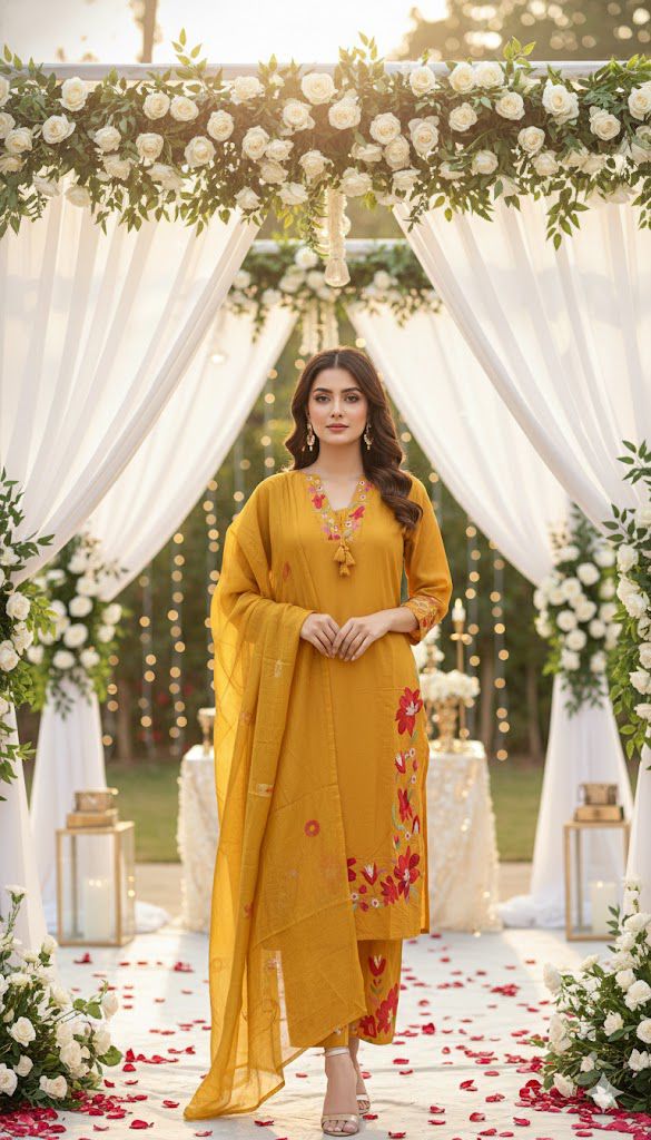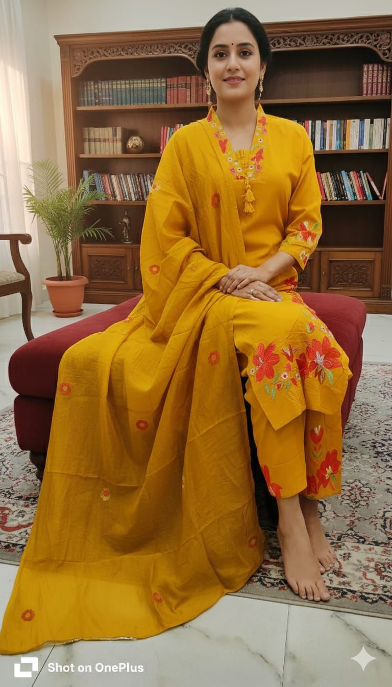 Step into effortless elegance with this newly launched Khadi Cotton Kurti Pant Dupatta Set. Designed in a straight silhouette with vibrant embroidery and hand brush detailing, this ensemble blends festive charm with everyday comfort.